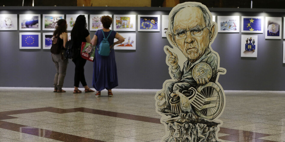 Cartoon-Ausstellung in Athen: Warten auf Schäuble Foto: ap