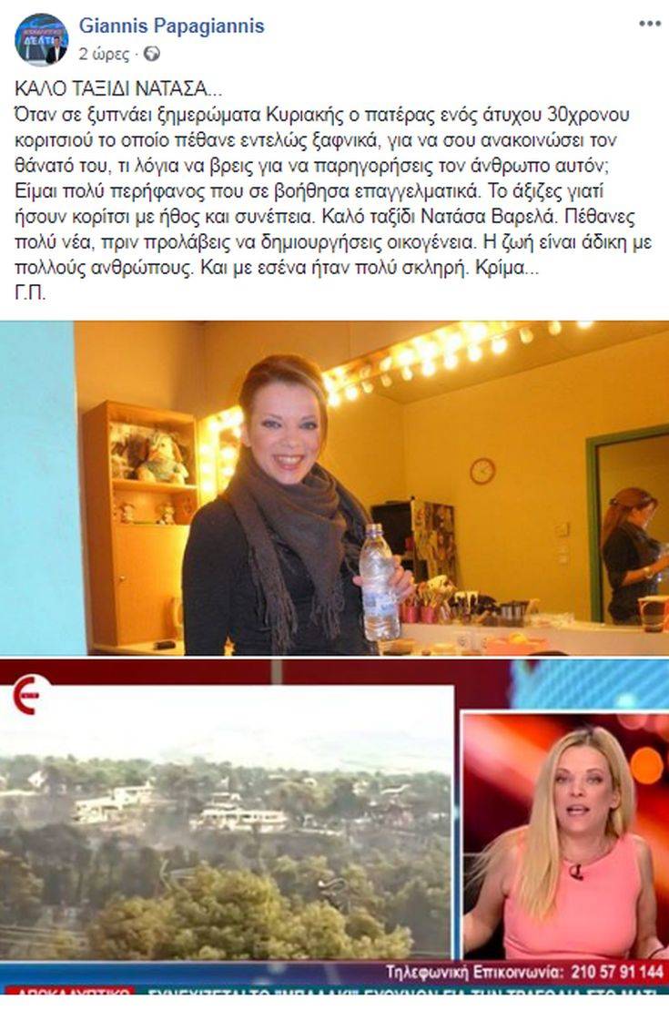 ..Δείτε την ανάρτηση του Γιάννη Παπαγιάννη στο Facebook:Όπως ανέφερε ο δημοσιογράφος Γιάννης Παπαγιάννης στην εκπομπή «Παιδιά από σπίτι» του Epsilon, μετά από επικοινωνία του με τον πατέρα της άτυχης παρουσιάστριας, η Νατάσσα Βαρελά πέθανε από διάτρηση στομάχου.