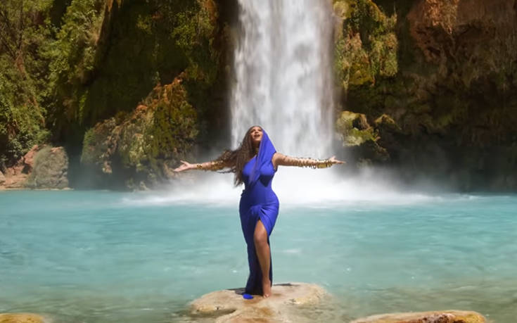 Φορώντας ένα εντυπωσιακό μωβ φόρεμα η Μπιγιονσέ εμφανίζεται στο βίντεο μπροστά από τους επιβλητικούς καταρράκτες Havasu Fall στην Αριζόνα με το νερό να τρέχει ορμητικά πίσω της.