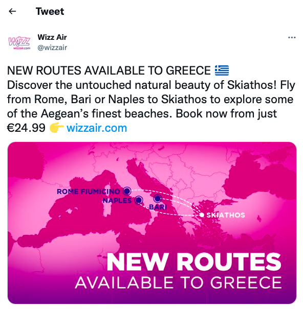 Έτσι για πρώτη φορά φέτος μέσω της Wizz Air οι επισκέπτες μπορούν να ταξιδέψουν για Σκιάθο με τέσσερα νέα δρομολόγια την εβδομάδα από Ρώμη (Fiumicino), Νάπολη, Μπάρι, Μιλάνο και οι πωλήσεις εισιτηρίων θα ξεκινήσουν στις 9 Απριλίου 2022.