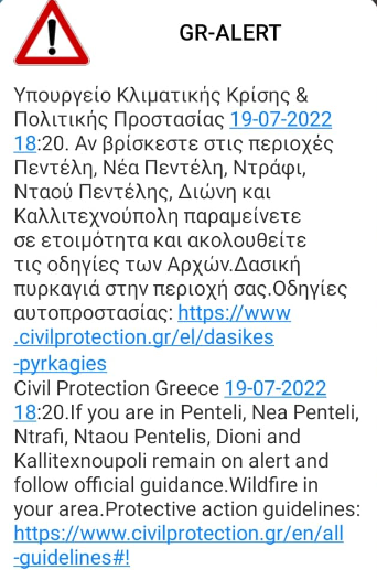 Συγκεκριμένα το μήνυμα αναφέρει: «Αν βρίσκεστε στο Ντράφι, εκκενώστε τώρα προς Παλλήνη. Δασική πυρκαγιά στην περιοχή σας. Ακολουθήστε τις οδηγίες των αρχών. Οδηγίες αυτοπροστασίας: https://www.civilprotection.gr/el/dasikes-pyrkagies