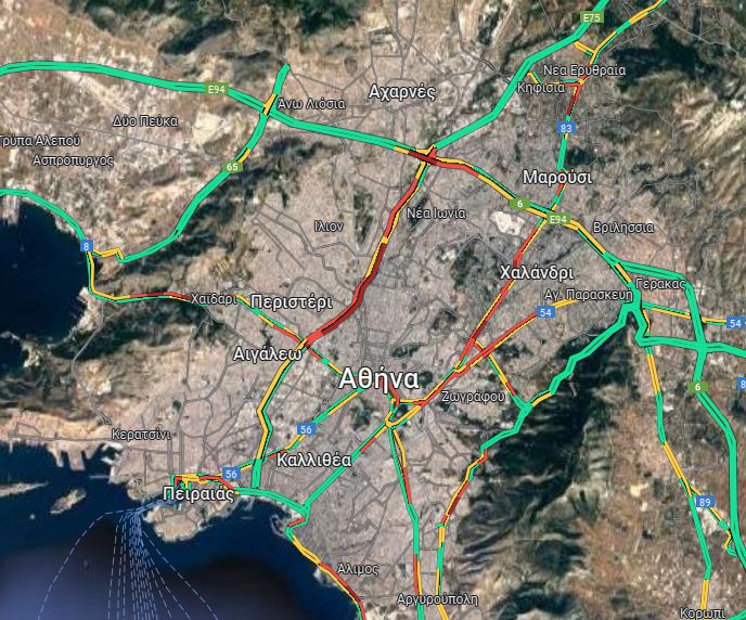 Στο «κόκκινο» βρίσκεται και ο Κηφισός, με τα σημαντικότερα προβλήματα να εντοπίζονται στην άνοδο από το ύψος της Λεωφόρου Αθηνών μέχρι τη Νέα Φιλαδέλφεια.