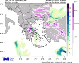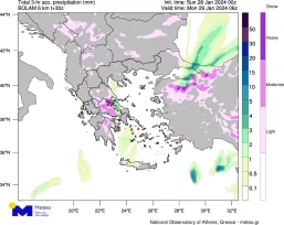 Γεωγραφική κατανομή των εκτιμώμενων βροχοπτώσεων και χιονοπτώσεων τις πρωινές ώρες της Δευτέρας 29/01, όπως υπολογίζεται από το αριθμητικό μοντέλο πρόγνωσης καιρού του meteo.gr / Εθνικού Αστεροσκοπείου Αθηνών.