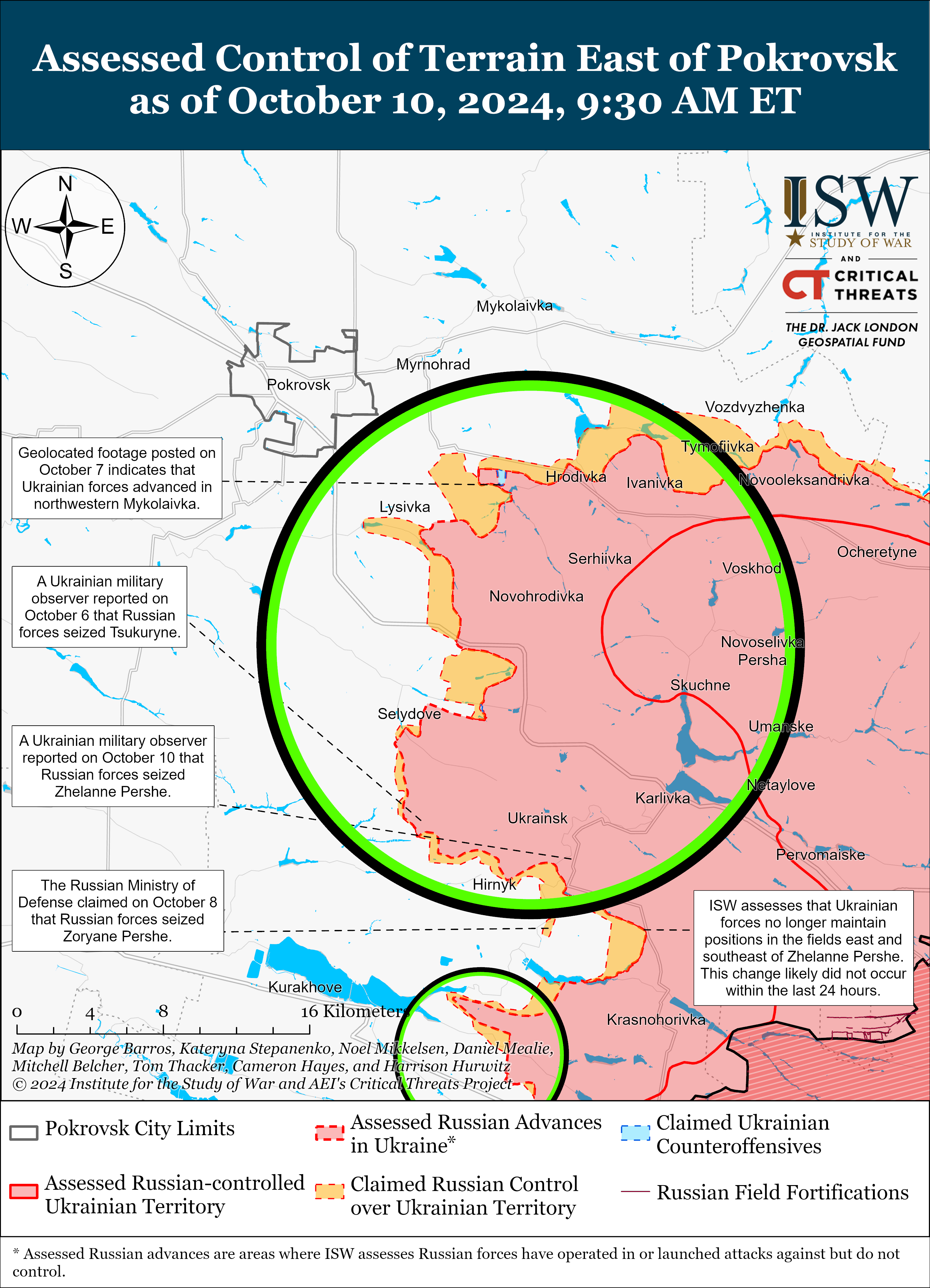 Οι ρωσικές δυνάμεις προέλασαν πρόσφατα νοτιοανατολικά του Pokrovsk εν μέσω συνεχιζόμενων επιθετικών επιχειρήσεων ανατολικά και νοτιοανατολικά του Pokrovsk στις 10 Οκτωβρίου.