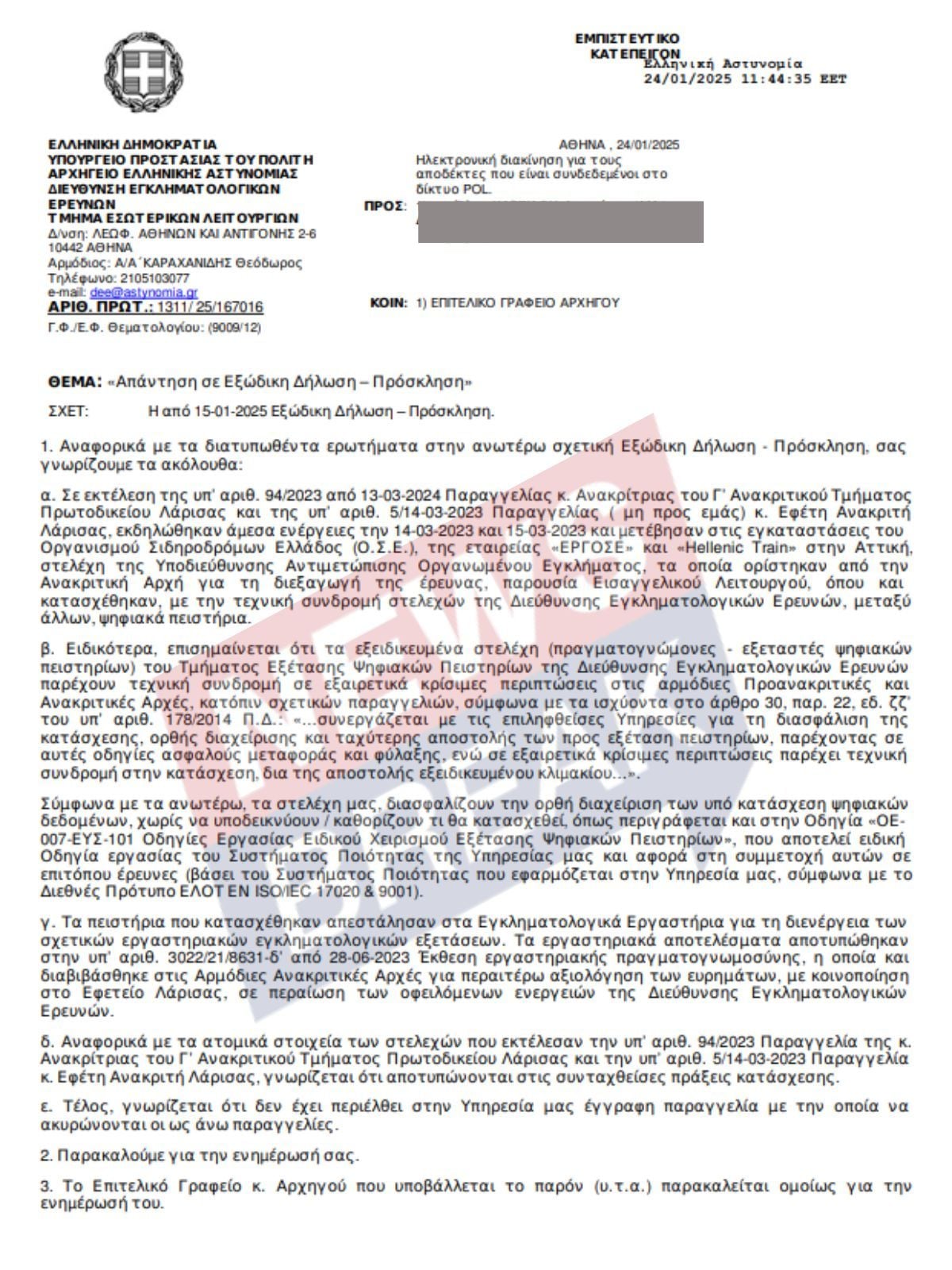 Οι κατασχέσεις είχαν ζητηθεί, αρχικά με την παραγγελία 94/13.03.2023 της Ανακρίτριας του Γ΄ Τμήματος Πλημμελειοδικών Λάρισας και κατόπιν από τον Εφέτη Ανακριτή Σωτήρη Μπακαΐμη, στις 14/3/2023 με την 5/14.03.2023 διάταξή του. Σε αυτήν αναφερόταν ρητώς ότι οι Αρχές καλούνταν να προσχωρήσουν «στην κατάσχεση κάθε φορέα ήχου, εικόνας και ψηφιακών δεδομένων – μορφής», που αφορούν στην 28/2 (ημέρα του δυστυχήματος) και στην 01/03 του 2023.